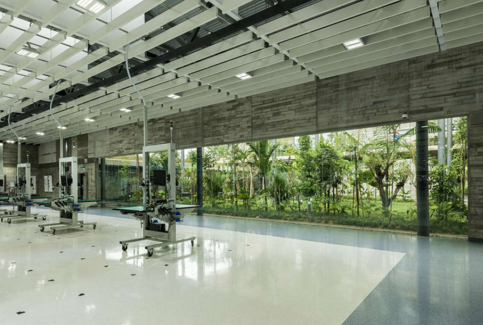 7. Искусственные водоемы, озеленение и другие природные элементы символизируют связь интерьеров производственного объекта с окружающей средой. Они обладают многими положительными свойствами с эксплуатационной точки зрения, например, очищают воздух от разного вида загрязнений и нормализуют влажность. Вклад элементов живой природы в повышение эстетической выразительности заключается в формировании эмоционального и визуального комфорта, благоприятной психологической обстановки, что актуально для высокотехнологичных и цифровизированных производственных объектов, особенно в условиях отсутствия зрительного контакта с естественным природным окружением [15]. В качестве примера можно привести фабрику по производству медицинского и спутникового оборудования «Парамит» (арх. бюро Design Unit Sdn. Bhd., Малайзия, 2017), где офисные, общественные и даже производственные помещения, в прямом смысле слова, утопают в зелени (рис. 7).