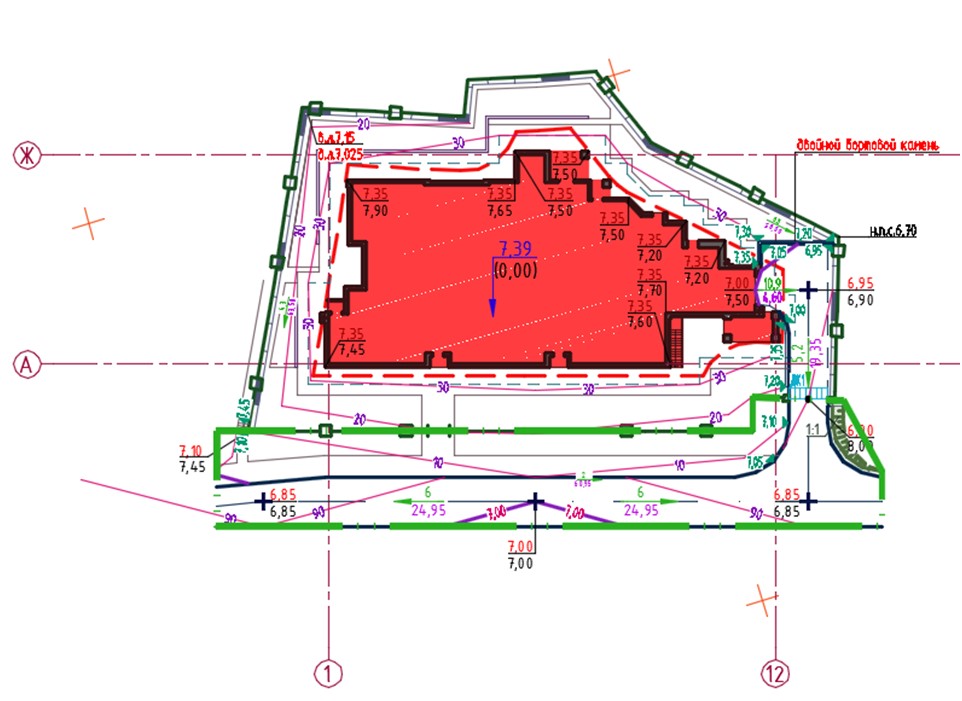 На рисунке 13 показан разработанный план организации земельного участка многоквартирного жилого дома с подземной парковкой с учетом градостроительных норм [4].