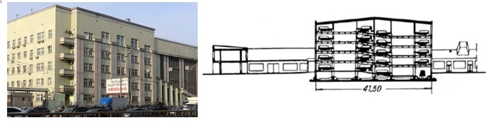 В СССР конструированием гаражных боксов занимались проетировщики самостоятельно, но в 1931 г. проектный институт Гипроавтотранс взял этот вопрос под свой контроль. Он выполняет проект первого многоэтажного гаража в Москве – это пятиэтажное зданий с полурампами на 300 автомобилей для отеля Интуриста на Сущевском валу (рис. 4).