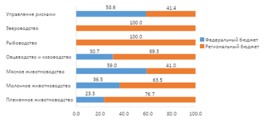 Наиболее высокий удельный вес средств федерального бюджета в общем объеме финансирования мер господдержки наблюдается по блокам «Мясное животноводство» (59%) и «Управление рисками» (58,6%) [19].